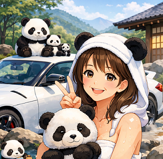 ちなみに、次の画像は、もし高市総理が辞めたら、たくさんのパンダや移民が戻ってきて囲まれるが、奈良県の山中の温泉で、愛車のスープラの横でお酒を飲んで湯っくり解放されるであろう彼女の様子を、ChatGTPチャッピーで作りました。